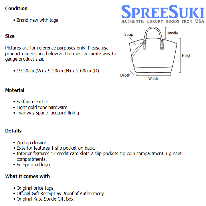 All our products are 100% authentic and purchased from Kate Spade stores in USA. We are a reputable registered business in Singapore and it is illegal to sell counterfeit goods in Singapore. This product also comes with a gift receipt which is printed by the Kate Spade store that we purchased the item from. It states the item that we purchased and the Kate Spade store that it was purchased from, proving the authenticity of the item. Buy with confidence.