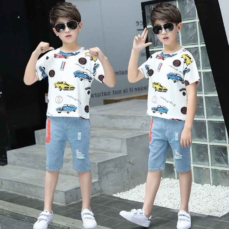 Children Short Sleeve Big Boy (5-14 years old) Outfits 2Pc Sets Cotton T-shirt Tops + Shorts Summer Casual Trendy Children's Clothes Set [S158]