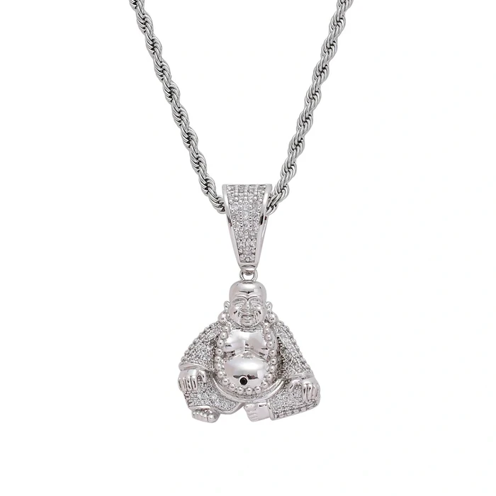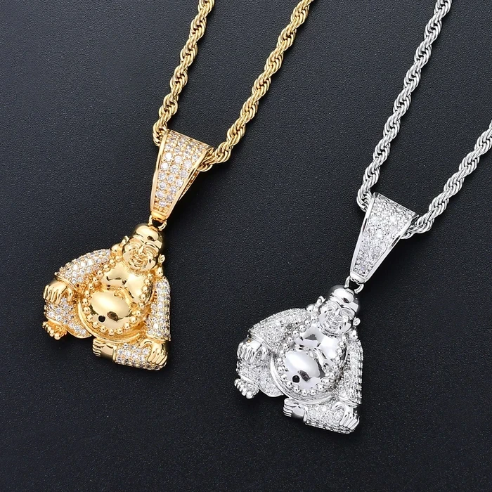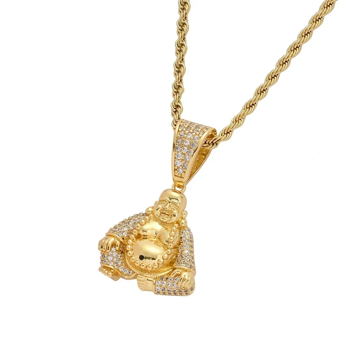 Micro Pave Laughing Buddha Certified Gold Pendant Real Diamond Necklace With 24" Rope Chain For Woman Men