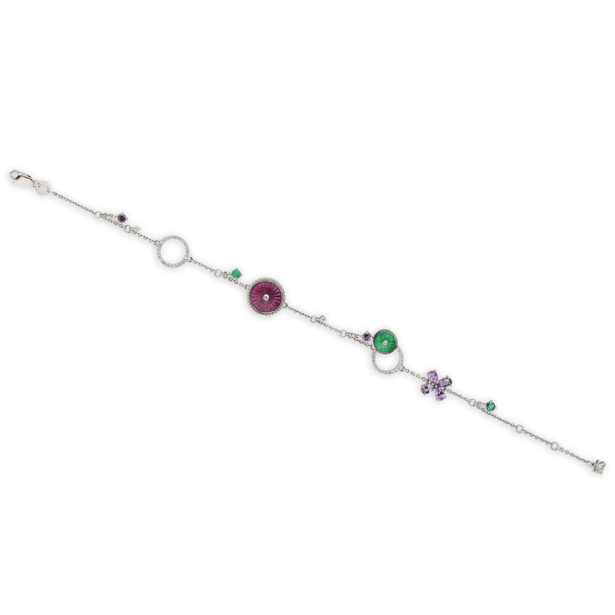 Crafted with exceptional attention to detail and unparalleled craftsmanship, this white gold bracelet with emeralds, amethysts, diamonds and guilloche enamel is a true work of art. Whether you wear it to elevate a special occasion outfit or as a statement piece in your everyday look, this bracelet is sure to become a treasured piece in your jewelry collection.