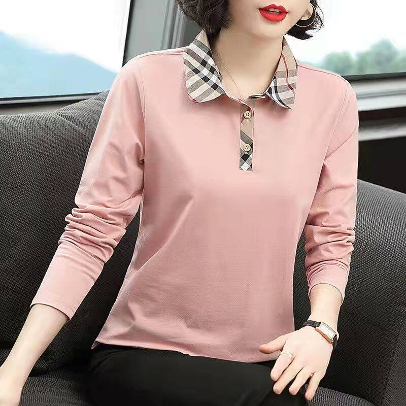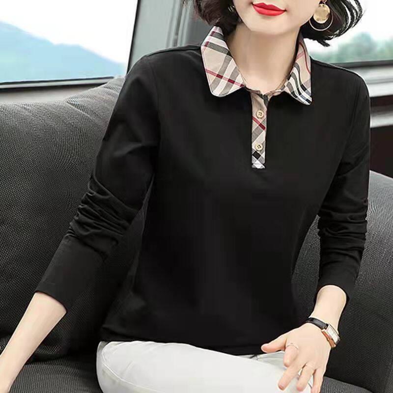 Free Shipping Long sleeve T-shirt Women Plus size Spring and Autumn New Trendy Oversize Temperament Checked Cotton Casual Polo Shirts Female Shirt Basic Stand Collar t shirts Tops