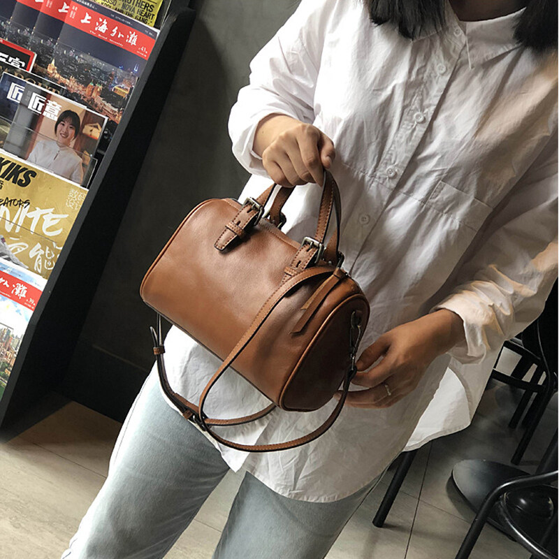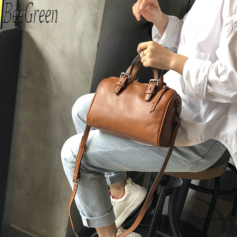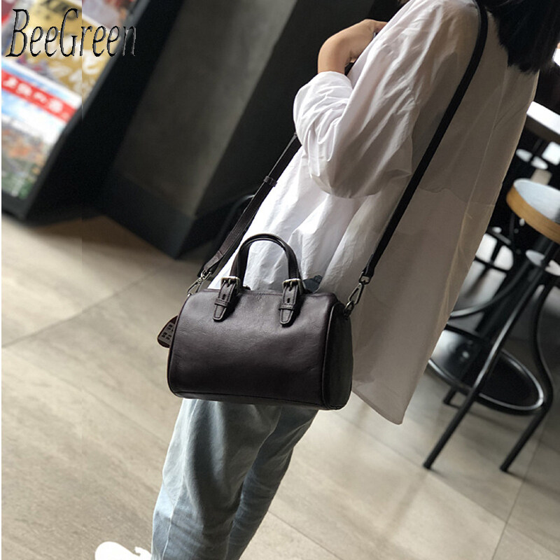 BeeGreen Real Leather Small Handbag Retro Design Boston Bag Soft Genuine Leather Shoulder Bag for Women