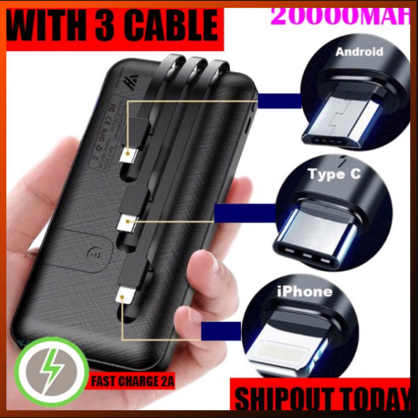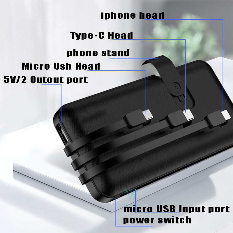 power bank built in three cable, one is for type C, one is for micro USB, one is for apple interface. it can charger three device at the same time, more convenient to hide and store.