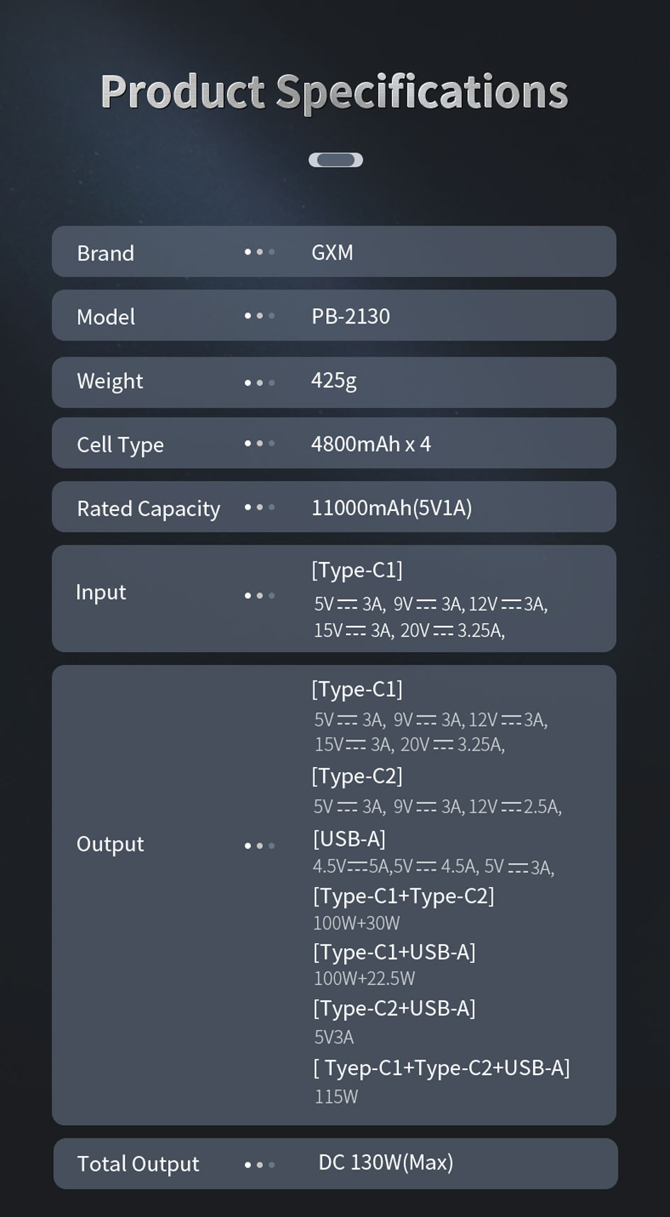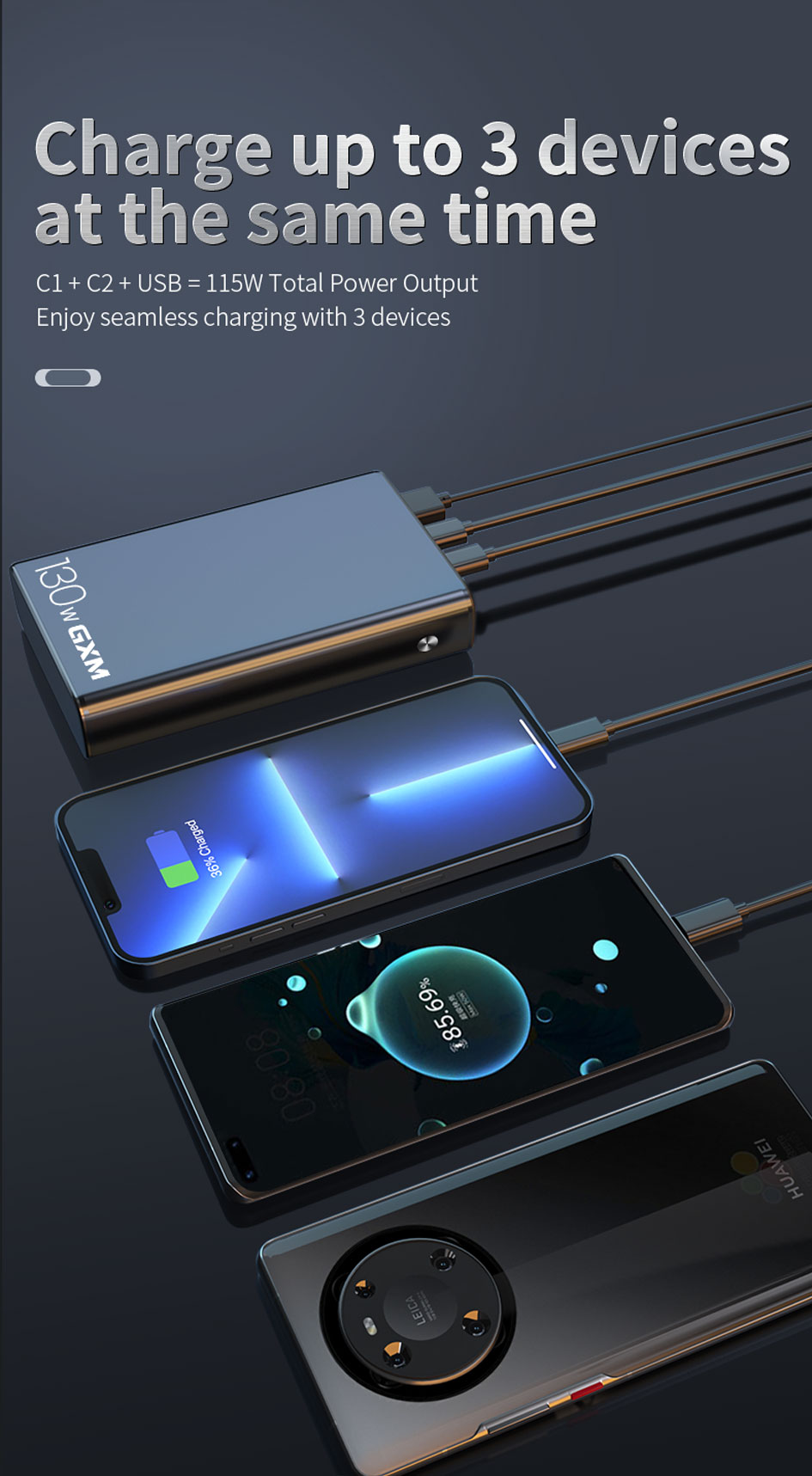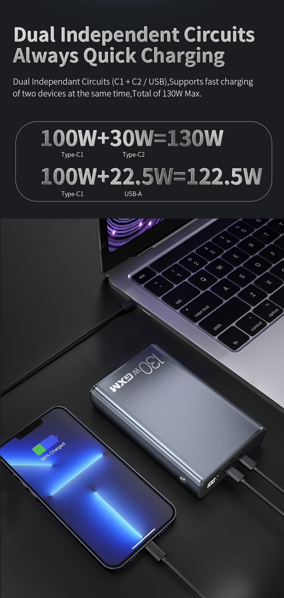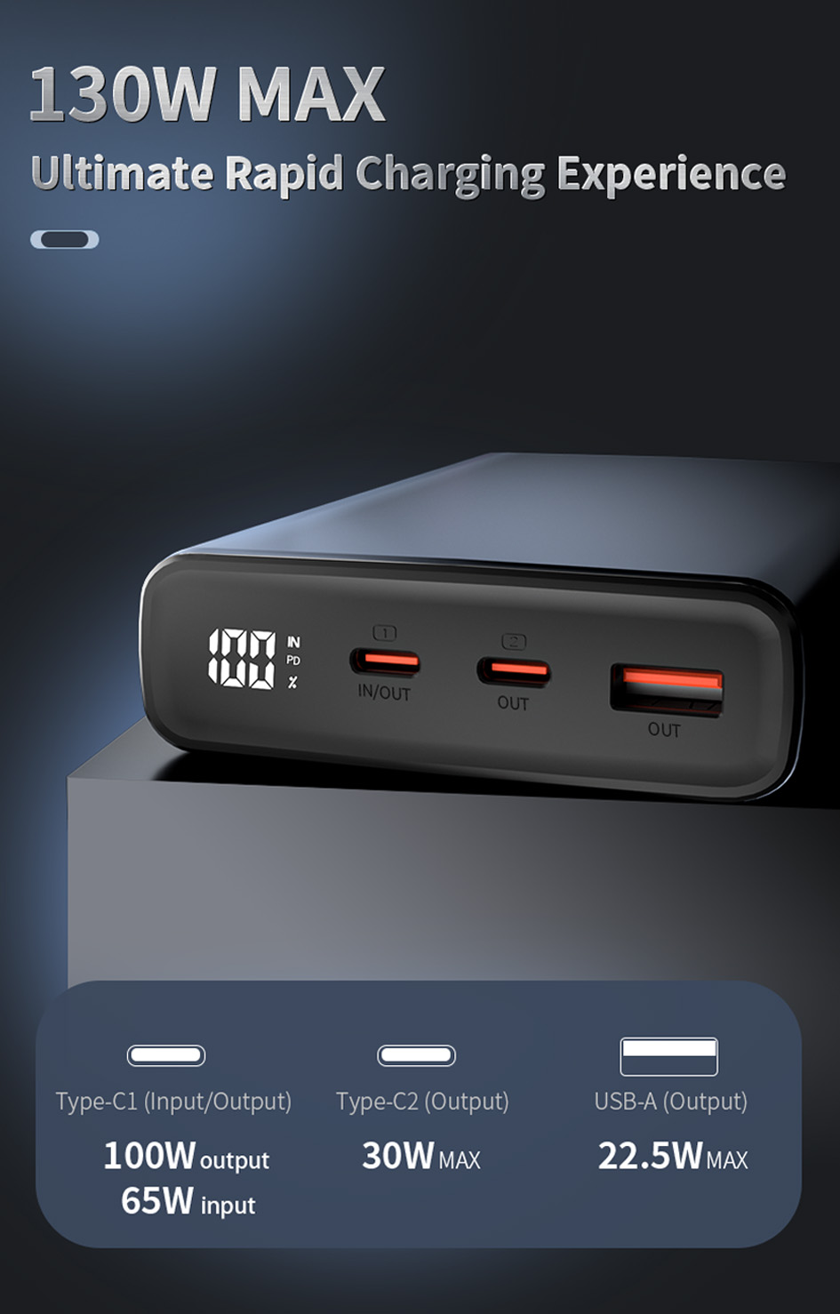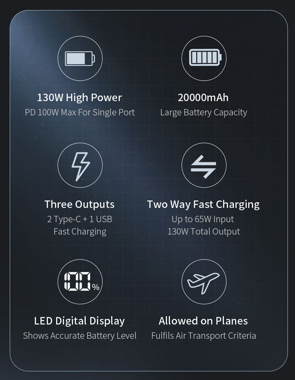 • Two-way Fast Charging: 130W Total Output | Up To 65W Input