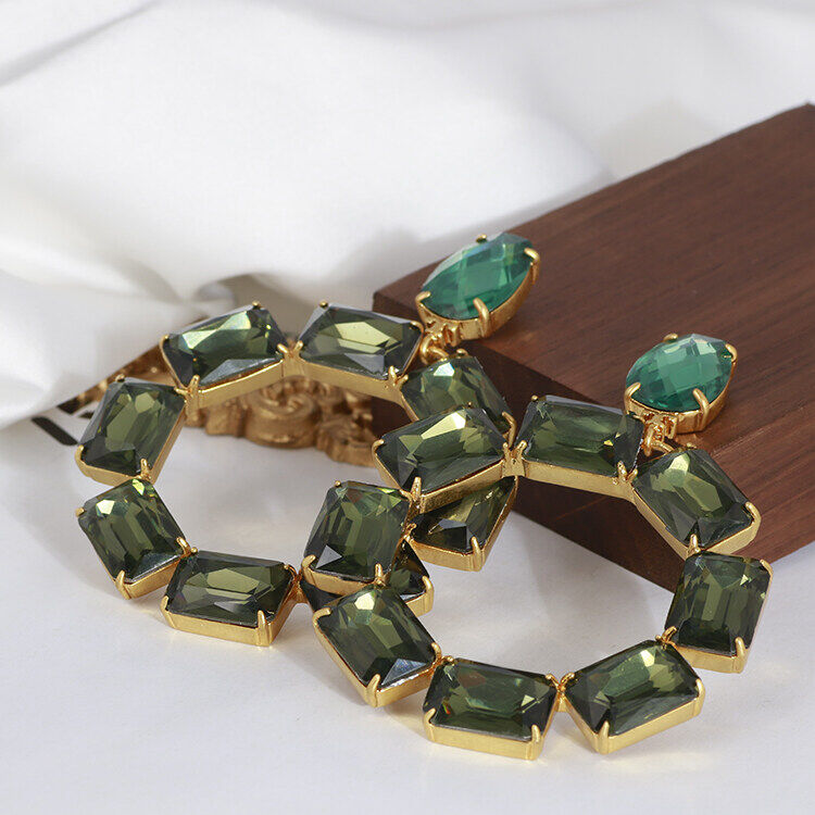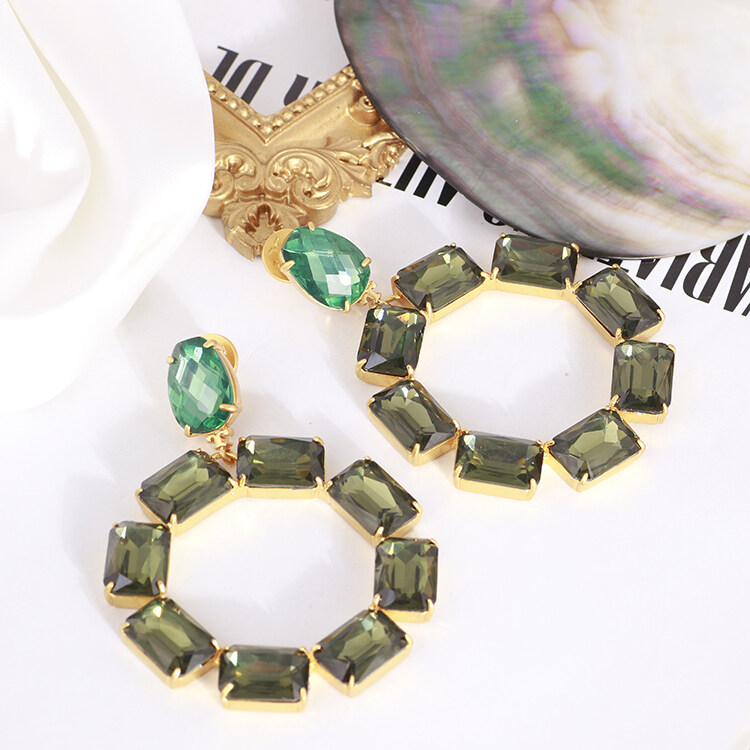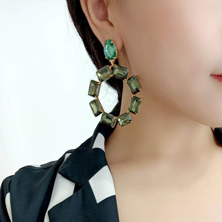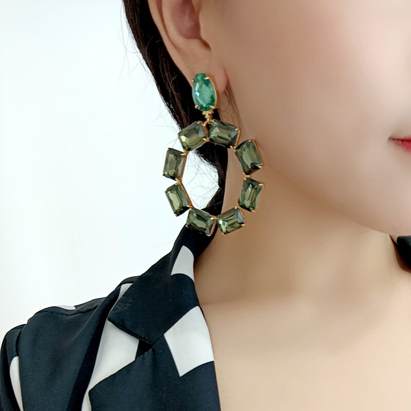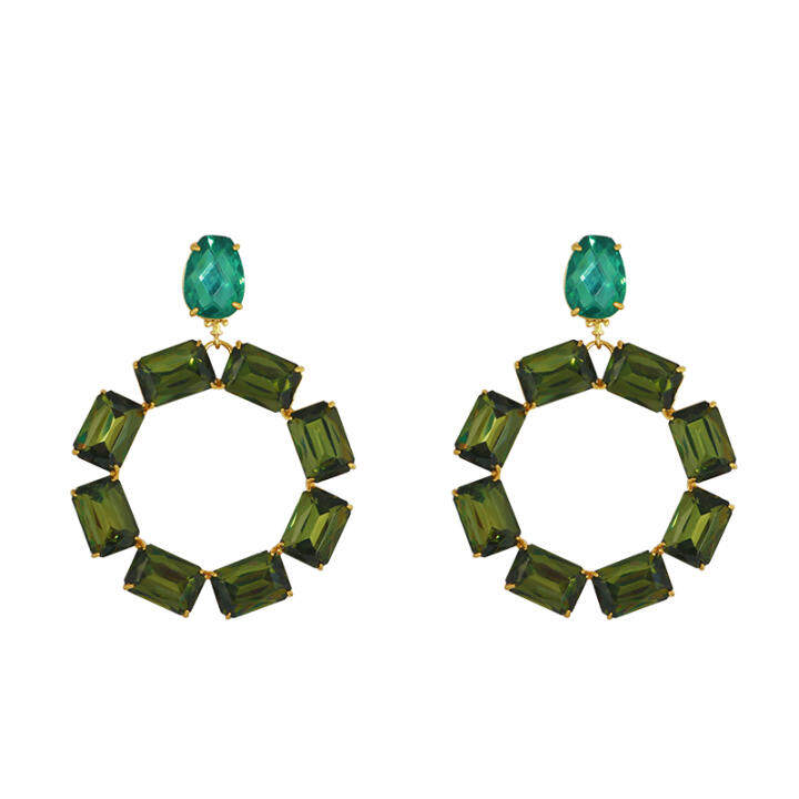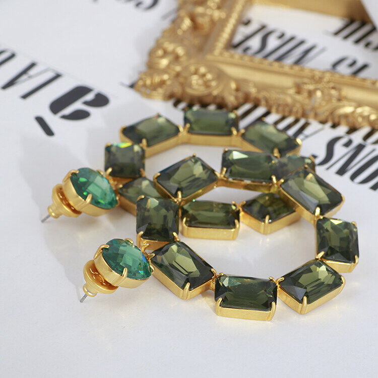 【Hong Kong Authentic Shipping】Tory Burch earrings Tory Burch exaggerated heavy-duty style inlaid with green rhinestones exaggerated Tory Burch earrings female
