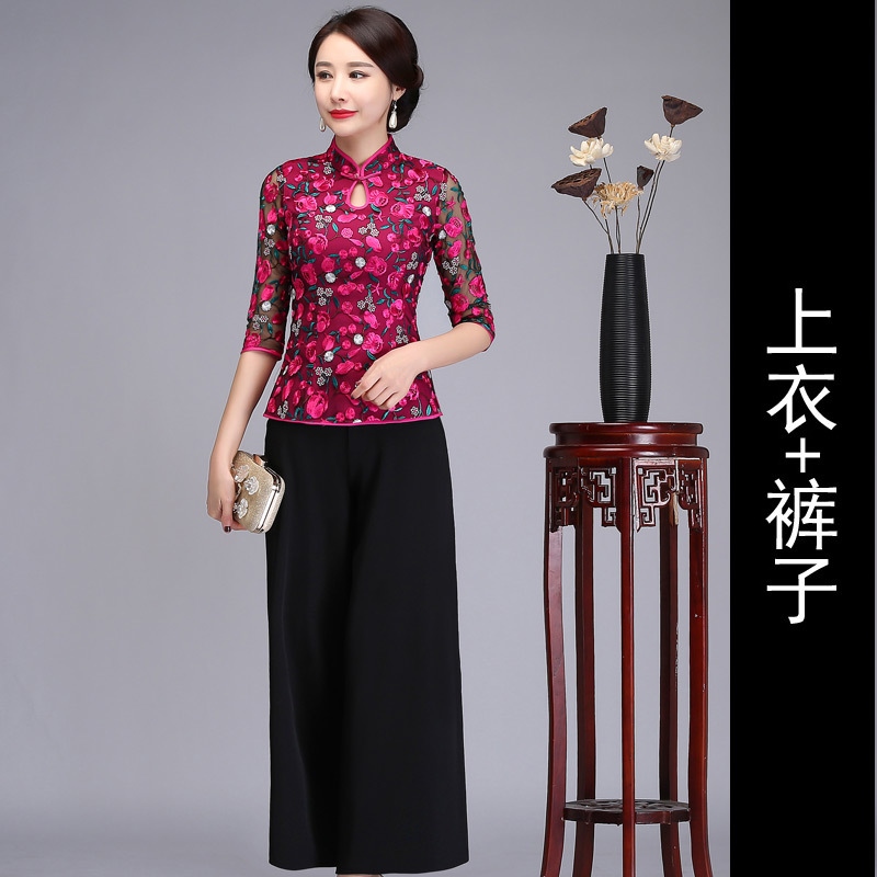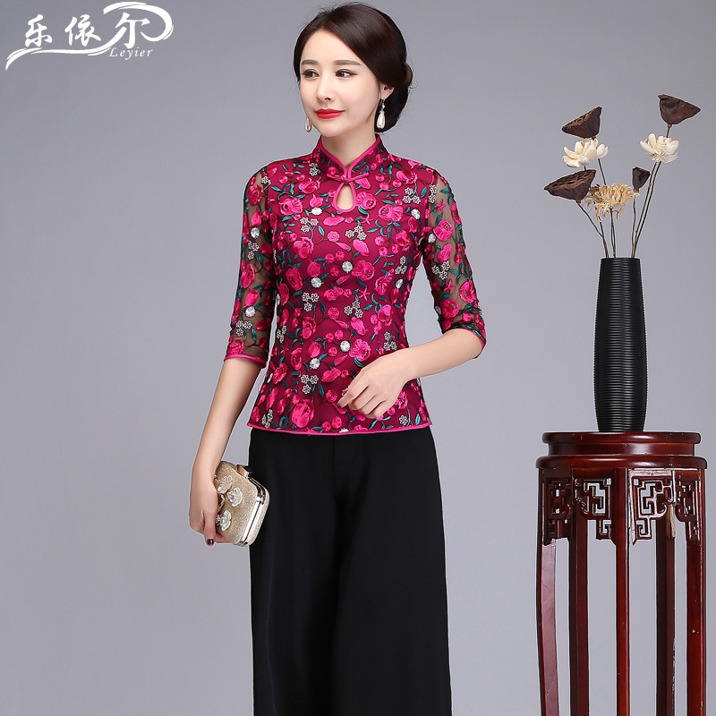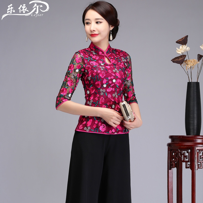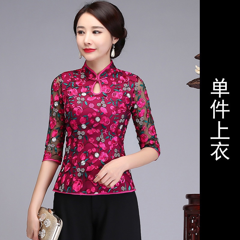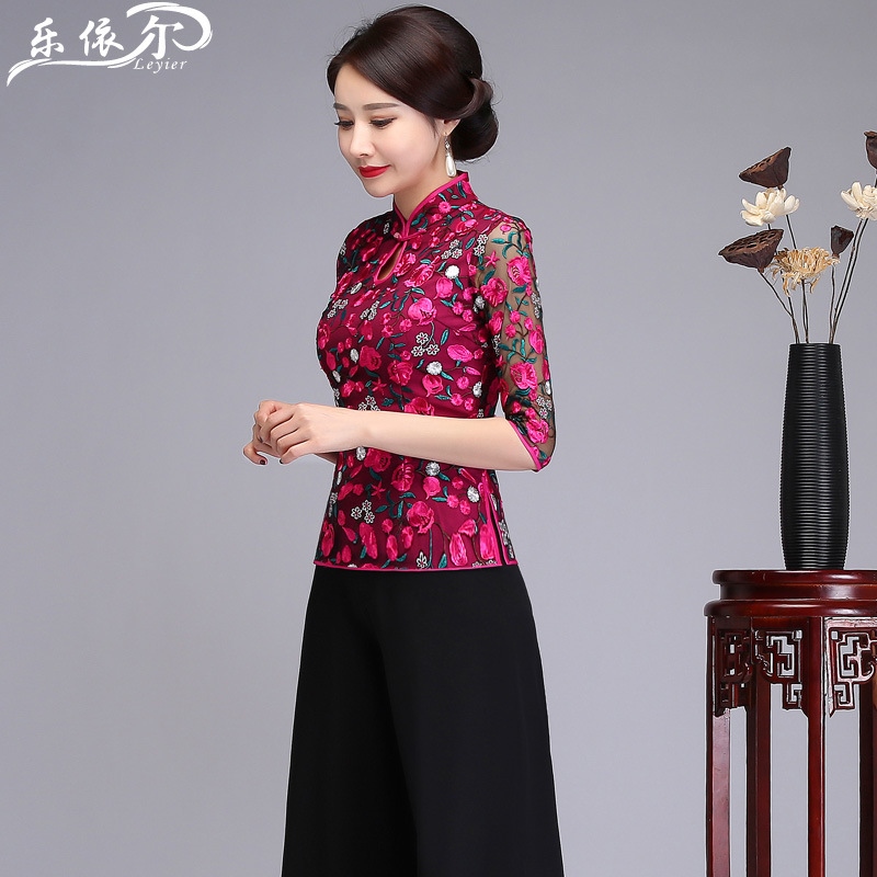 △◑☃ Spring and summer improved floral suit cheongsam top short Chinese mother's dress wedding embroidery large size
