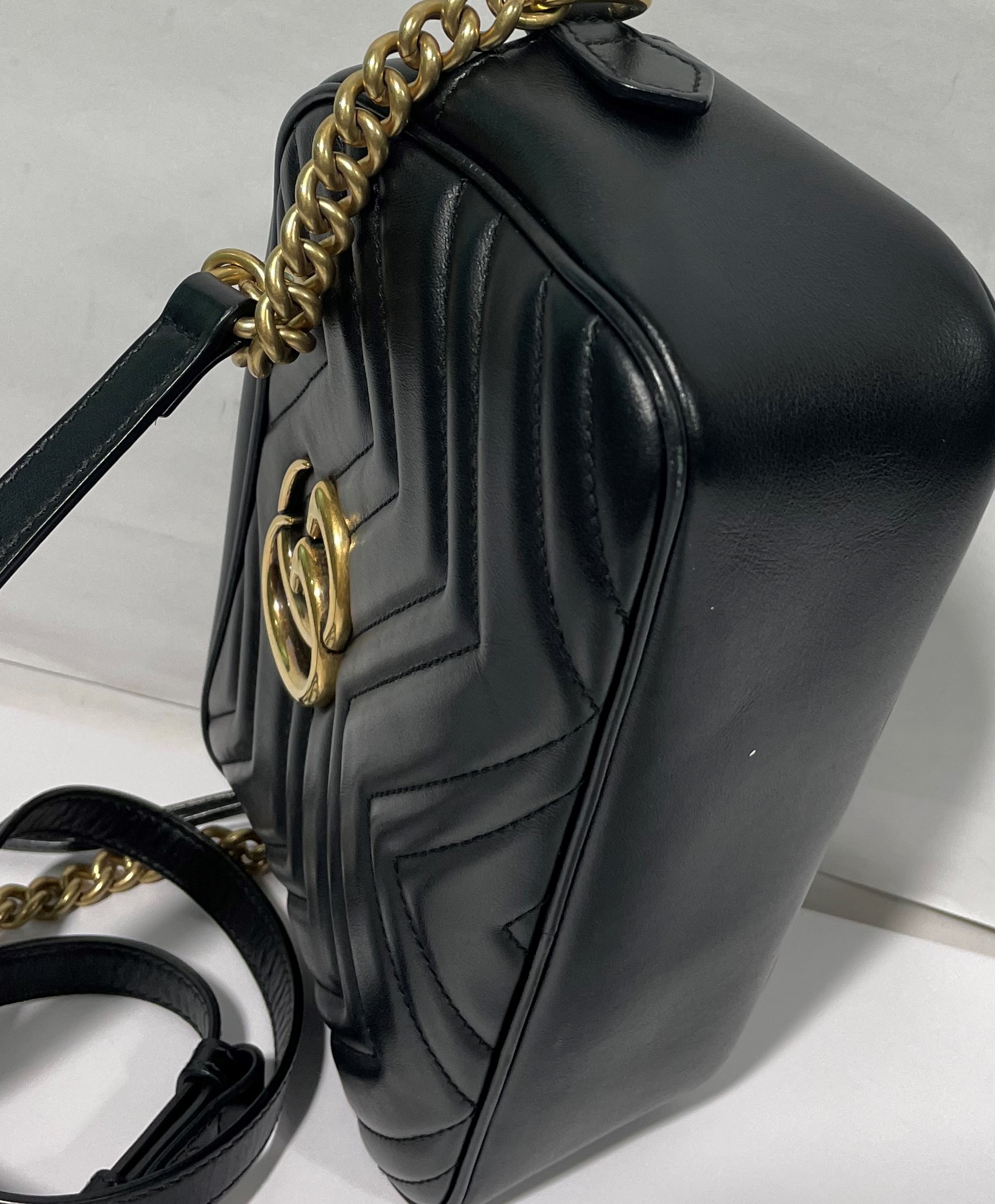- Black matelasse chevron leather with GG on the back with antique gold-toned hardware and interior open pocket. Antique gold-toned hardware and Double G. Adjustable chain shoulder strap can be worn as a shoulder strap or cross body.