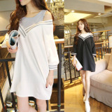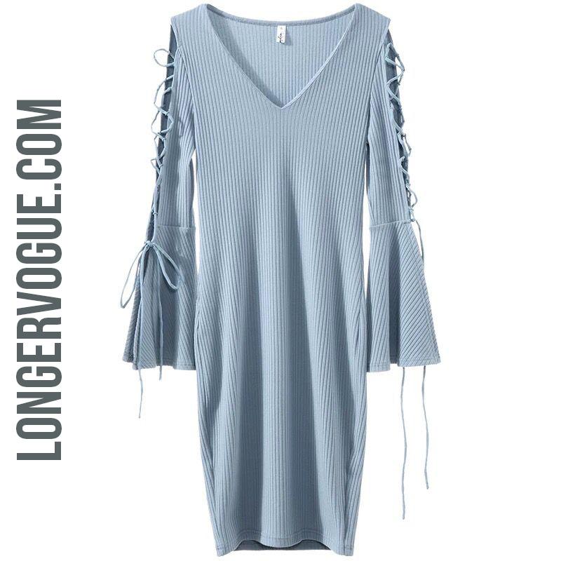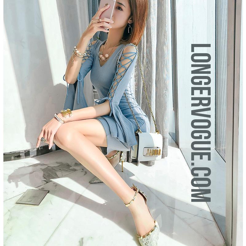 Ribbon flair sleeve V neckline sexy stretchy designer shift dress outfit OPD114